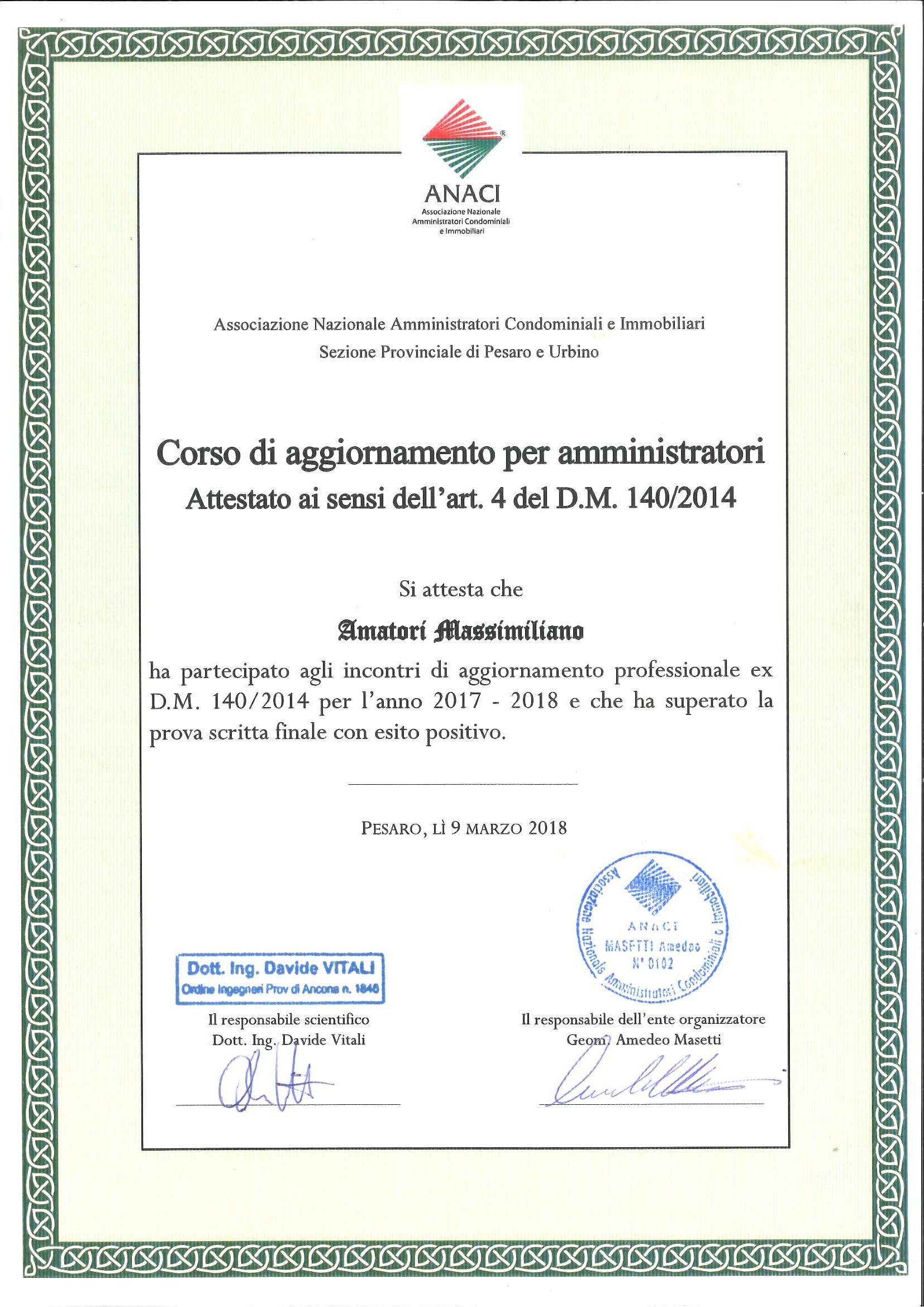 La formazione professionale è garantita e soprattutto certificata, mediante crediti formativi rilasciati da Anaci (Associazione Nazionale Amministratori Condominiali ed Immobiliari), l’associazione di categoria d’appartenenza, che indiscutibilmente è la più importante e rappresentativa d’Italia, con centinaia d’iniziative annuali, quali convegni, master, corsi e dibattiti giuridici e tecnici, tenuti dai massimi esperti nazionali.